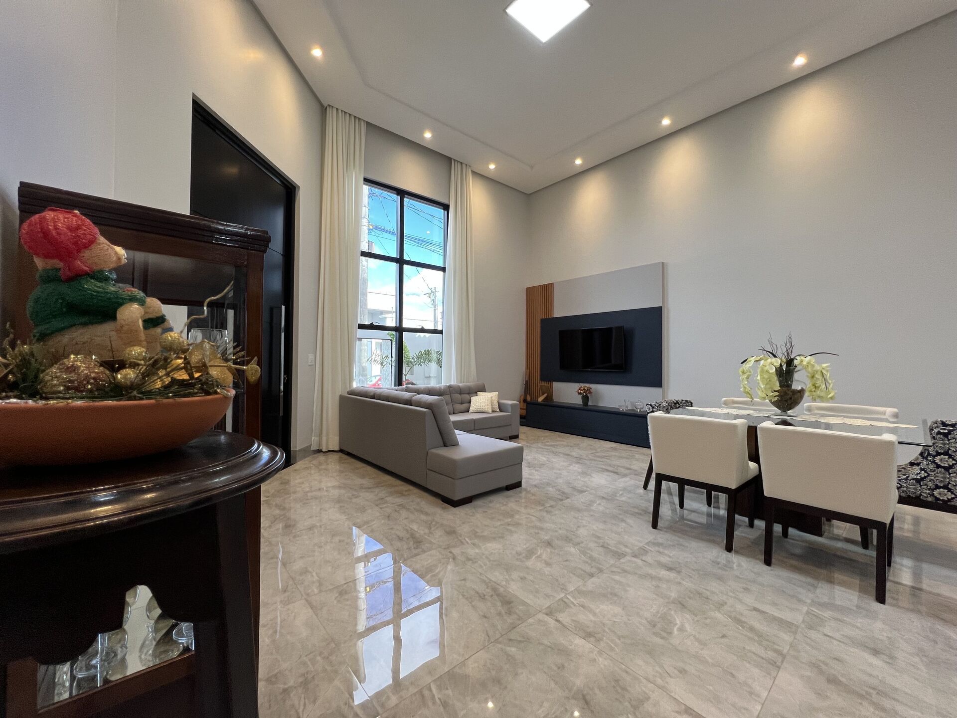 Sala dois ambientes com pé direito duplo.